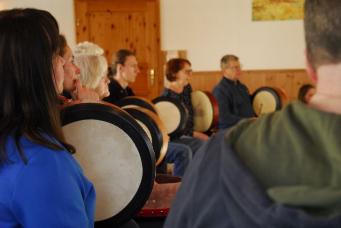 Die Kurse richten sich an alle Bodhráninteressierten: von absolutem Anfänger:innen bis zum Fortgeschrittenen, der noch neue Tipps und Spieltechniken mit nach Hause nehmen möchte. Nach einer kurzen Einführung steht die Vermittlung der Technik des Bodhrán-Spiels im Vordergrund, aber es wird auch auf das Zusammenspiel mit anderen Musiker:innen (Session), sowie auf Strukturen und Begleitmuster in der traditionellen irischen Musik eingegangen. Anhand von Musikbeispielen werden die unterschiedlichen Rhythmen der traditionellen irischen Musik vorgestellt und Stile des Bodhrán-Spiels aufgezeigt. Leihbodhráns sind vorhanden.